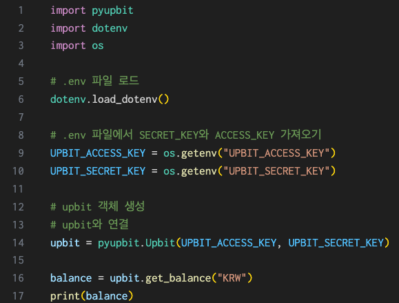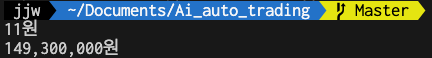 dotenv 라이브러리를 이용하였더니, 실제 제 잔고에 있는 KRW(원화)가 제대로 출력되는 것을 확인했습니다.