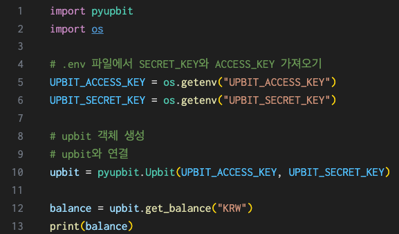 이후에 실제로 Upbit와 통신이 주고받을 수 있는지 확인하기 위해 KRW(원화) 잔고를 출력해주는 간단한 코드를 작성해보았습니다.