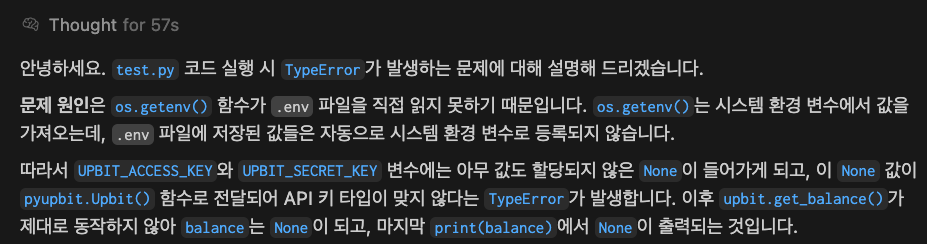AI에게 오류 발생 원인과 해결 방법을 물어보았더니, 기존 .env 파일의 API 키 값들을 가져오는 과정에서 os 라이브러리 만으로는